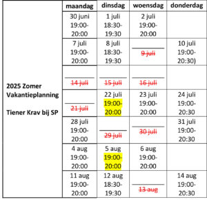 LET OP: tijdens de zomervakantie ben je niet gebonden aan 1 locatie. Is er een keer geen les -> wijk dan uit naar de dichtsbijzijnde locatie! Bijvoorbeeld, is er een keer geen les in Veenendaal, ga dan naar Ede of Nijmegen. Is er een keer geen les in Nijmegen Noord Oosterhout, ga dan naar Nijmegen Noord Lent. Op die manier kan je de hele zomervakantie gewoon doortrainen.